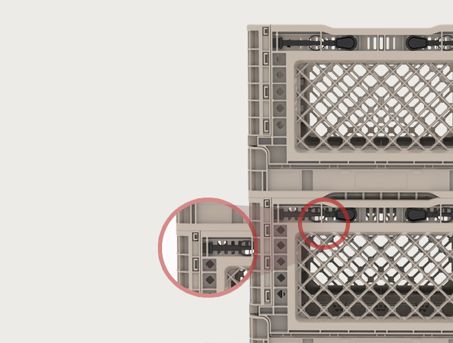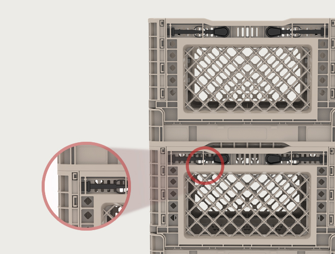 폴딩박스 상층에 맞물리는 네 모서리 전체가 지지되어 쉽게 무너지거나 물건이 쏟아지는 것을 방지합니다.